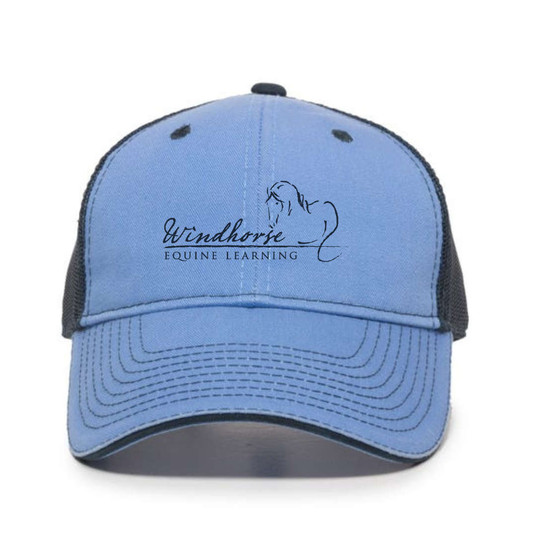 Trucker hat with embroidered Windhorse Logo. Garment washed cotton twill front panels and mesh back panels make for a breathable cap perfect for the outdoors. One size fits all.